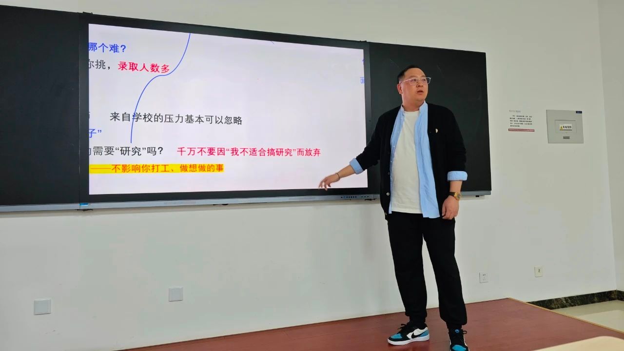 学生考研的主要去向。他鼓励同学们要正确认识“认真起来”的自己,切忌眼高手低,在综合考虑评估自身情况后,报考符合自身发展愿景的学校,只要走上考研这条路,就一定要向着一战成功的目标进发。