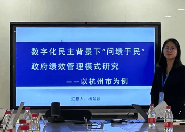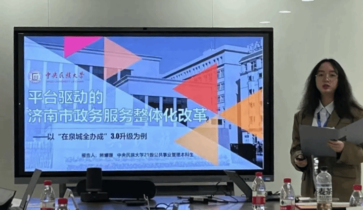 学生代表熊姗珊就《平台驱动的济南市政务服务整体化改革——以“在泉城全办成”3.0升级为例》一题进行学术作品展示,杨絮颖就《数字化民主背景下“问绩于民”政府绩效管理模式研究——以杭州市为例》一题进行学术作品展示。