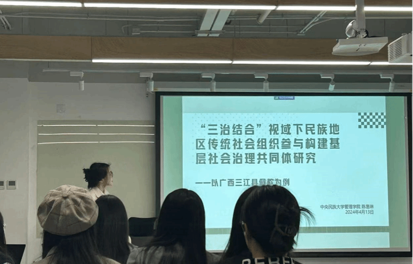 学生代表陈易琳就《“三治结合视域下民族地区传统社会组织参与构建基层社会治理共同体研究——以广西三江县侗款为例》一题作学术作品分享,教师嘉宾指出调研需要进行深入的田野调查,并且要跳出材料本身,需要在更广阔的层面上讨论社会真实,寻找其本质。