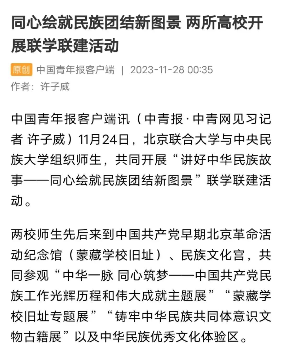 通过本次联学联建活动,同学们深刻感受到中华民族是具有强大认同度和凝聚力的命运共同体,各族人民要牢固树立休戚与共、荣辱与共、生死与共、命运与共的共同体理念,不断构筑中华民族共有精神家园。未来学院将进一步加强与北京联合大学的合作,使同学们主动承担起民大学子应有的责任,走出校园讲好中华民族共同体故事、大力宣介中华民族共同体意识,不断创新传播方式、丰富传播内容、拓宽传播渠道,为推进民族团结进步事业、建设中华民族现代文明作出新贡献。